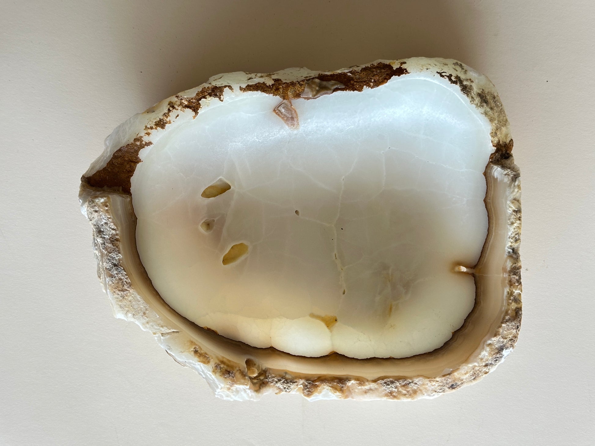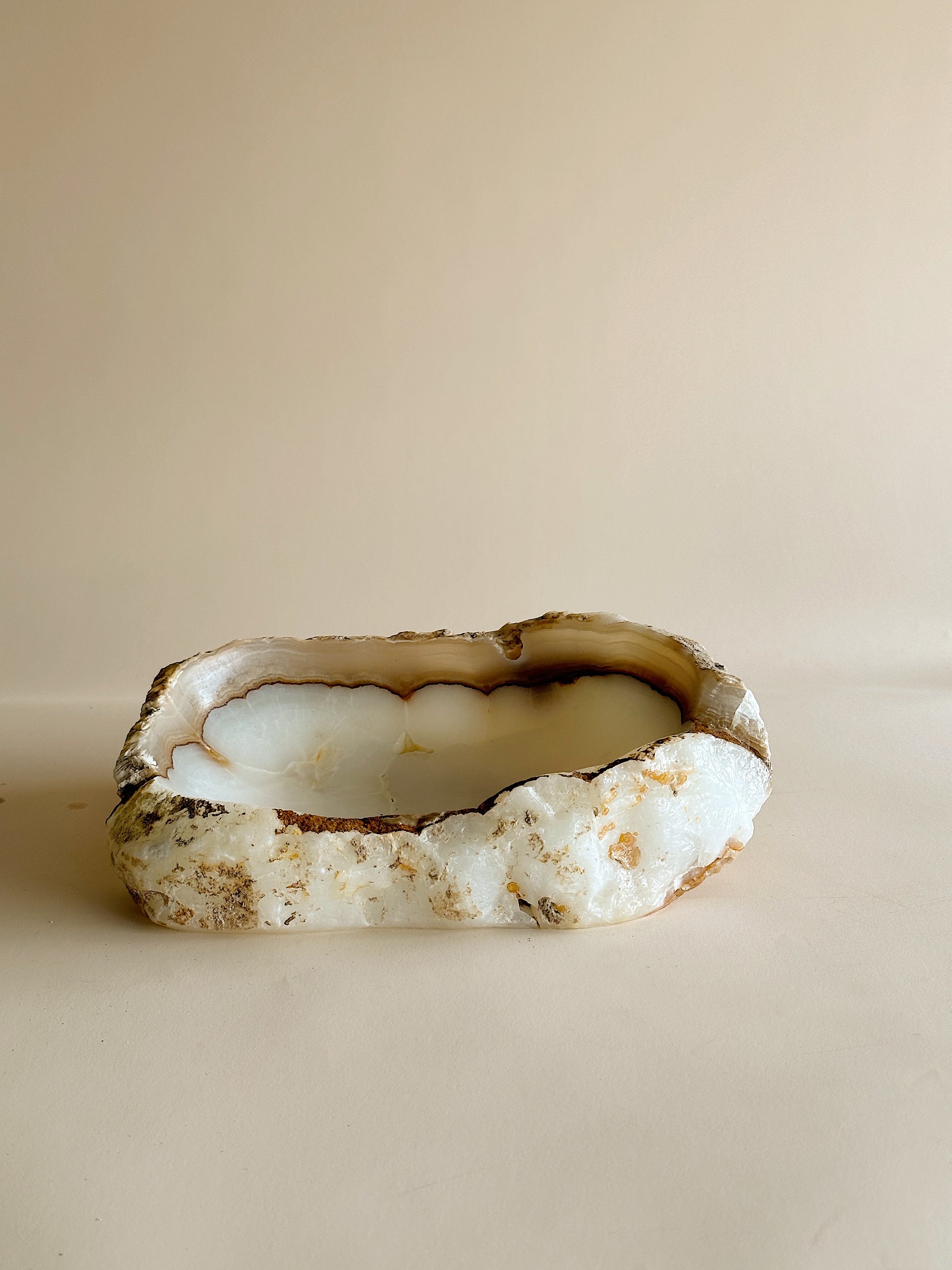Bring a tough of organic charm to your space with this hand-carved onyx catch all bowl. Its raw, natural shape and subtle color variations make each piece truely one of a kind. Perfect for holding jewelry, keys, or small treasures, this versatile bowls adds warmth and texture to any surface. Whether placed on a coffee table, console or bedside, it's a beautiful blend of functionality and natural beauty.